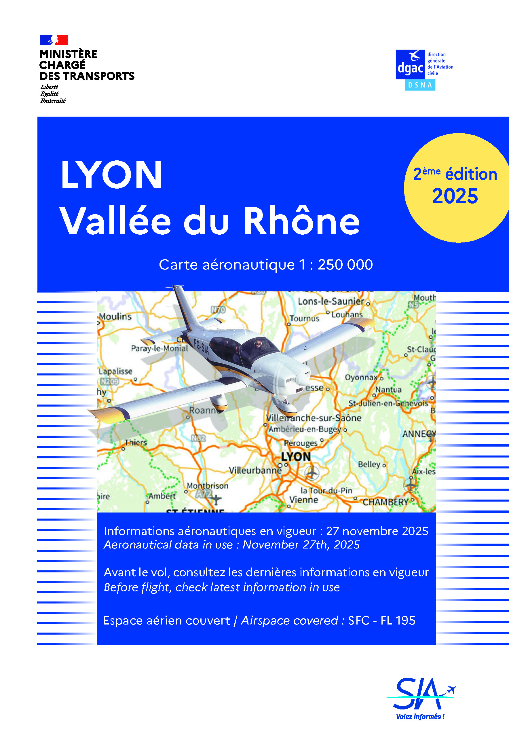 Cette carte aéronautique appelée LYON VALLEE DU RHONE couvre une zone rectangulaire délimitée