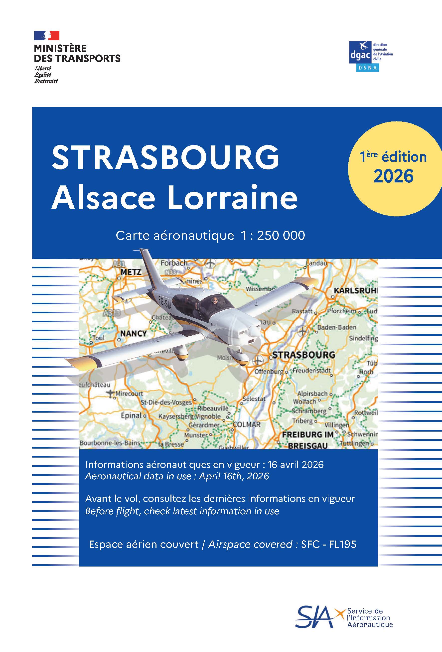 Cette carte aéronautique appelée STRASBOURG ALSACE LORRAINE couvre une zone rectangulaire délimitée