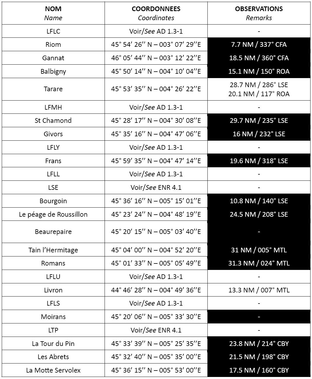 | Les pilotes doivent contacter par radiotéléphonie Marseille ACC/FIC et se conformer aux clairances délivrées. | Pilots must contact Marseille ACC/FIC and comply with instructions. | |||