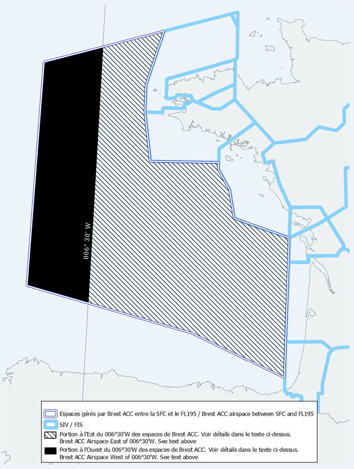 | Au-dessus du FL 115 et à l’Est du méridien 006°30’W, dans les secteurs gérés par BREST ACC, les services de la circulation aérienne sont disponibles. | Above FL 115 and East of meridian 006°30'W, in sectors managed by BREST ACC, air traffic services are available. | |||