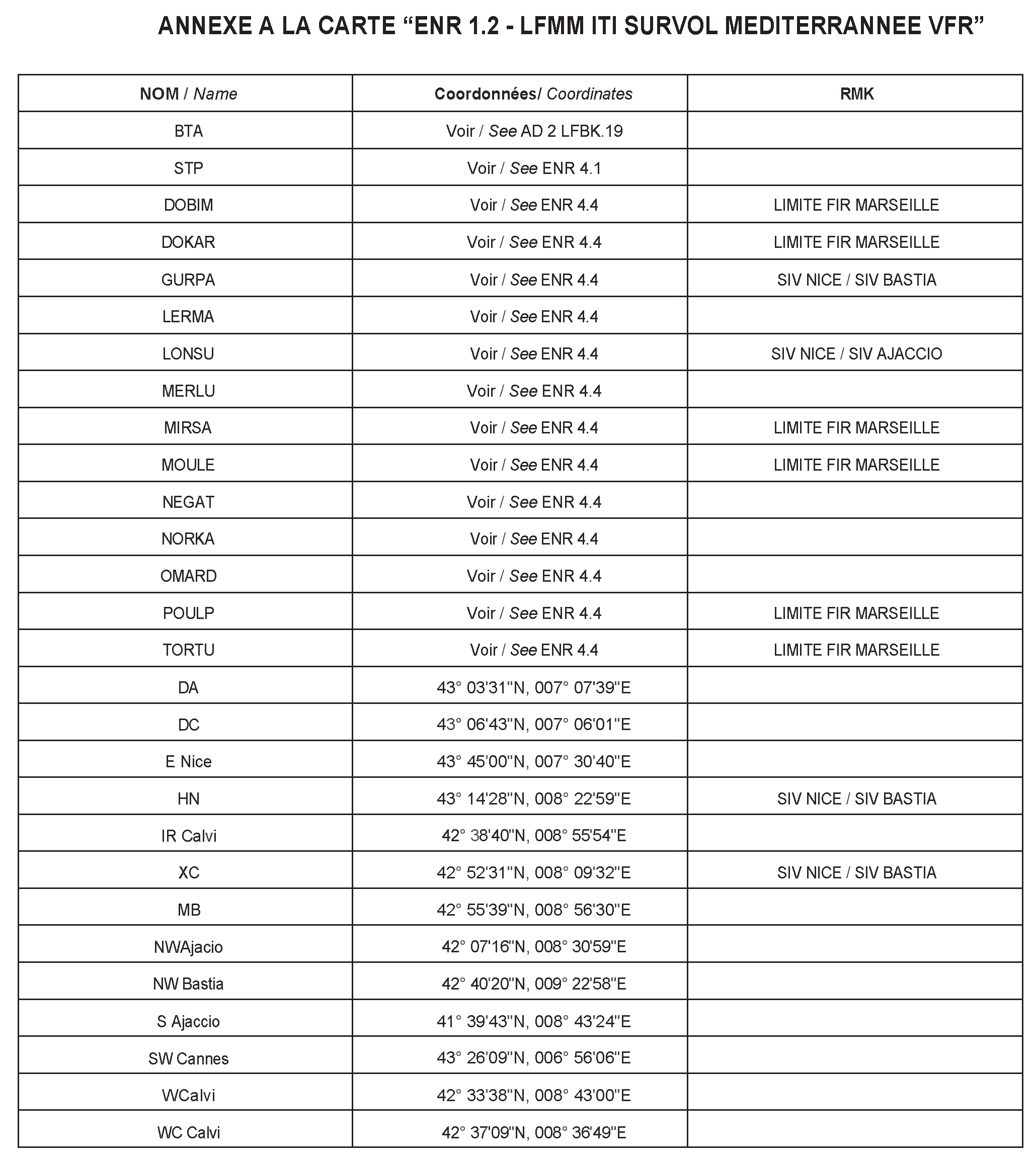 | Le contact radio est obligatoire avec le centre de coordination et de contrôle marine de la Méditerranée (CCMAR MED) avant toute pénétration. Le contact téléphonique avant la mission est fortement recommandé. | Radio contact must be made with the Mediterranean Naval Control and Coordination Centre (CCMAR-MED) prior to any penetration. Telephone contact prior to the flight is highly recommended. | |||