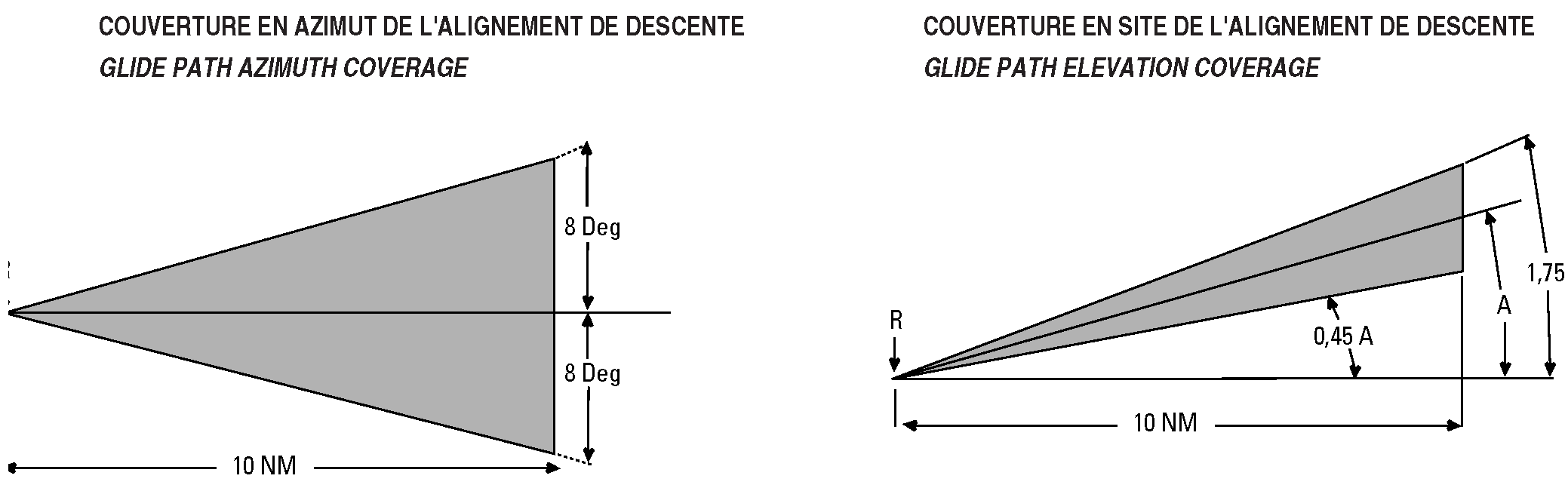 | Le même découpage de l'espace est utilisé dans le plan vertical pour assurer le guidage en site : un secteur où les indications sont proportionnelles à l'écart angulaire par rapport à l'axe de descente complété par une zone de couverture où les signaux indiquent au pilote sa position par rapport à l'axe de descente (au-dessus ou au-dessous). On prendra garde à la couverture en azimut de l'alignement de descente qui est limité à + 8 degrés, ce qui est bien inférieur à la couverture de l'alignement de piste (+ 35 degrés) ”cf schéma ci-dessus”. Il est donc illusoire et dangereux de vouloir intercepter l'alignement de descente avant d'être sur l'axe de l'alignement de piste. | The same airspace breakdown is used vertically to ensure elevation guidance i.e: a sector where the indications are proportional to the angle deviation with respect to the glide path angle completed by a area of coverage where the signals indicate to the pilot his position with respect to the glide path line (over or below this line). The pilot's attention is drawn to the azimuth coverage of the glide path which is limited to ± 8 degrees, which is far less than the course line coverage ± 35 degrees) “see diagram below”. It is therefore dangerous and illusive to try and intercept the glide path before the course line has been reached. |