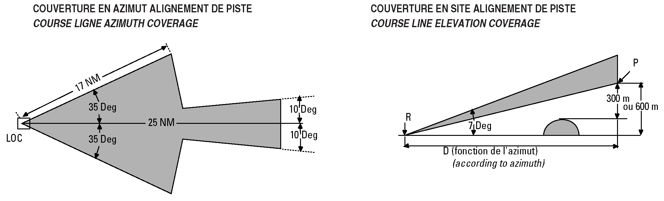 Dans certains cas le premier secteur peut même être plus étroit du fait de perturbations dues à l’environnement. Les limites du secteur utilisable sont alors publiées dans l’AIP. | In some cases the first sector can even be narrower due to the environment disturbances. The limits of the available sector are then published in the AIP. | |||