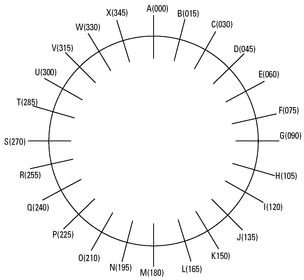| Le secteur est toujours décrit par deux lettres désignant les radials délimitant le secteur en partant de la première lettre, dans le sens des aiguilles d'une montre, jusqu'à la deuxième. | The sector is always described by two letters designating the radials delimiting the sector, starting from the first letter clockwise to the second. | |||